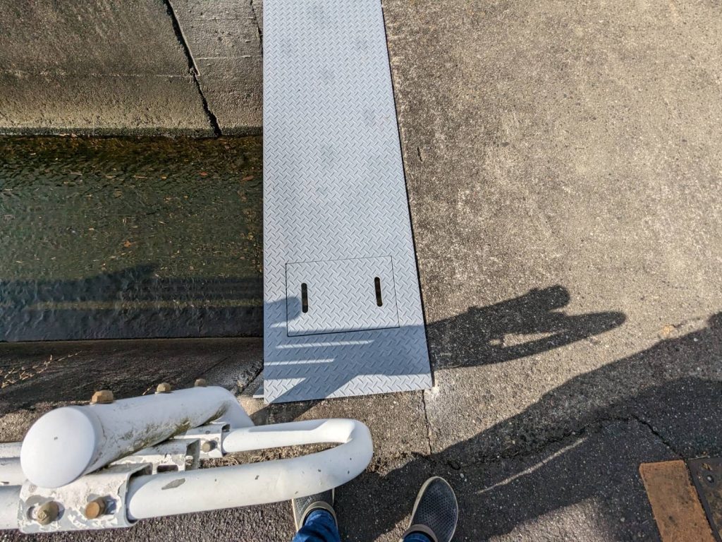 そこで今回はコストを抑えながら問題を解決する方法として、既存のコンクリート橋を活用した拡幅工事をご提案しました。具体的には、橋の片側に鉄板を設置して通行幅を確保する施工方法を採用しました。鉄板は現地での採寸を行ったうえでオーダー製作し、現場の状況に合わせた精度の高い施工を行っています。また、拡幅部分の下にある水路には隣接する農地へ水を流すための開口部が設けられていたため、その部分へ容易にアプローチできるよう鉄板を加工し、取り外し可能な蓋を設置しました。