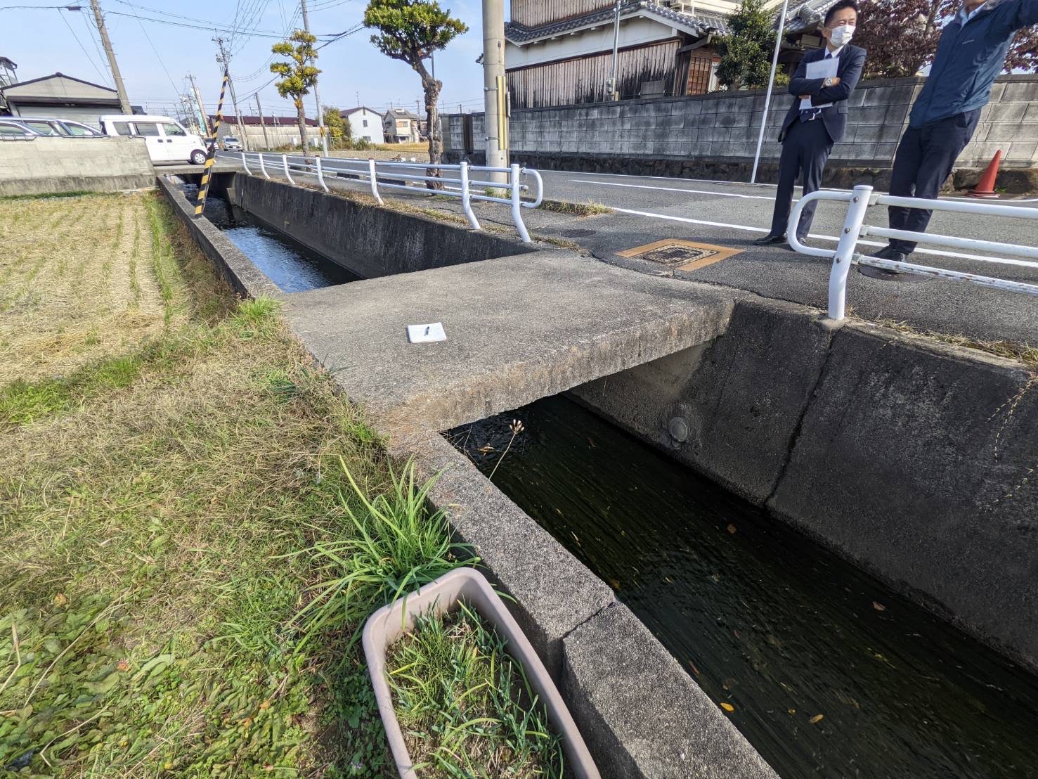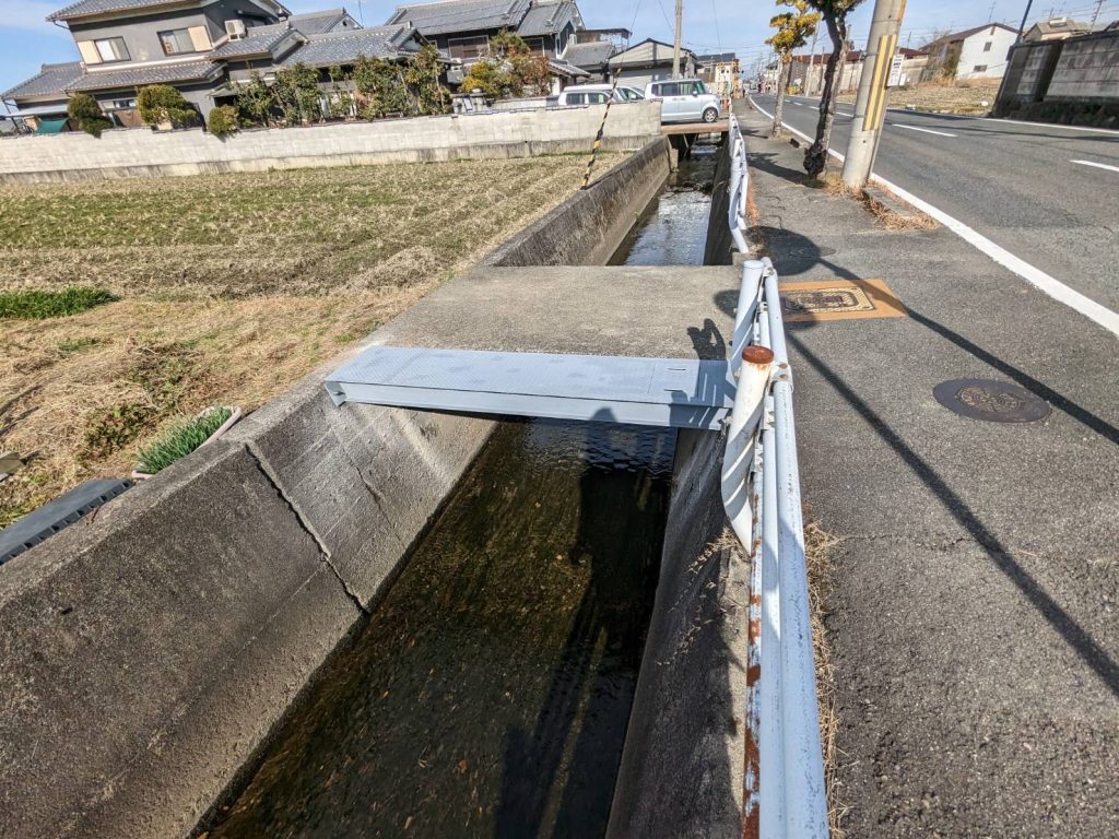 ご相談の内容は、道路から農地へ入る進入路の途中に水路があり、その上に設置されている既存のコンクリート橋の幅が狭く、軽トラックや農機具の通行が難しいというものでした。日々の農作業の中で、車両の進入時には細心の注意が必要となり、脱輪の危険性もあることから作業効率の低下につながっている状況でした。